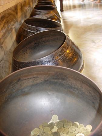As I walk around the corner, pasts the soles of Buddha’s feet, I see a row of pots along the wall. A woman drops a few coins into one of the pots before continuing on.