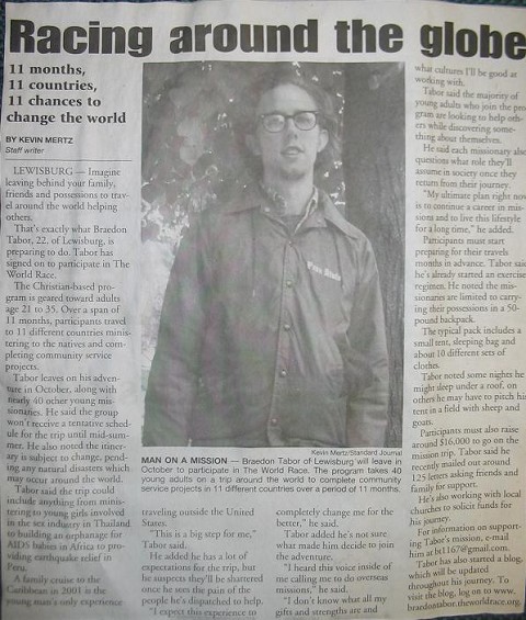 In other news, I was also in a local newspaper. I met with a man named Kevin from The Standard Journal on a Monday, we spoke about The World Race for about an hour, and I saw a huge (about half-page) spread about The Race and me the very next day.
