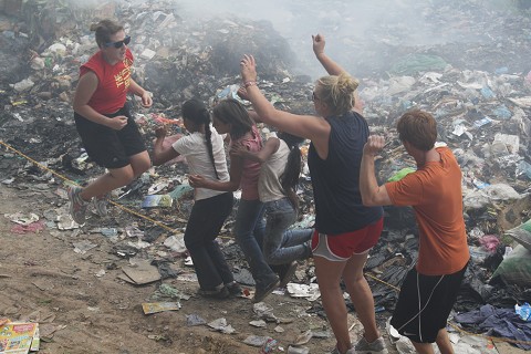 My group of six eventually meets back up with the other seven doing ministry that day in the middle of the road. They have a rope that we used the day before at the orphanage for limbo and jump rope. Before long, we have attracted the attention of several of the children living in the area. And, after some coaxing and modeling, we manage to get a handful of them in on the action. In the meantime, a couple of other teammates have begun to help a man search for plastic bottles, containers, whatever that can be re-sold (via recycling) in the piles of rubbish that lie beneath him. His two young children had been helping while watching the other kids jump.