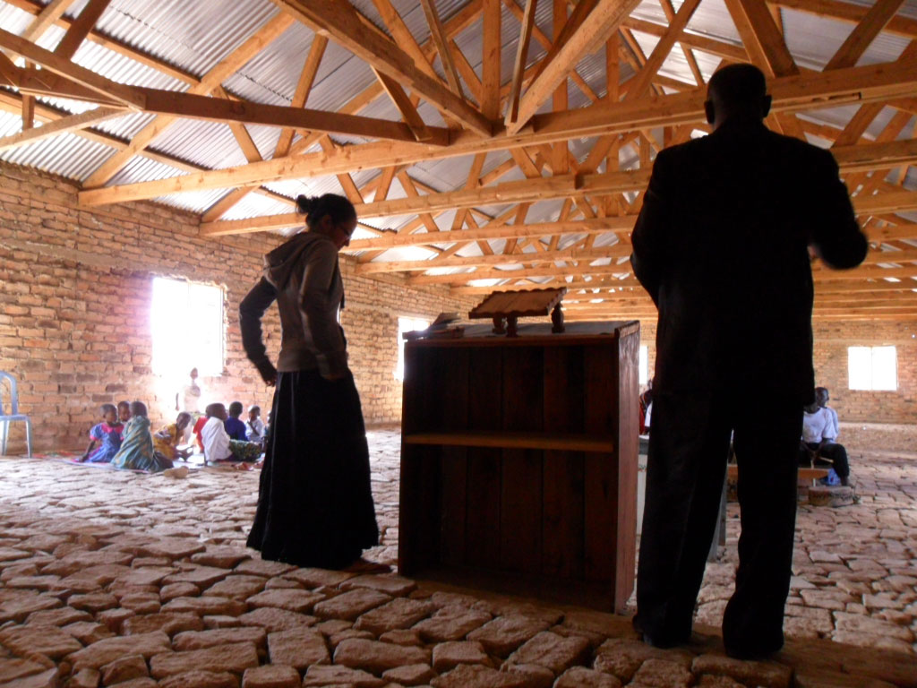The large building is made of handmade bricks held together by, what I assume is, a mix of cement and mud. Sounds of Swahili words being sung without the aide of a microphone or instruments (save, one drum) drift out of the paneless windows and doorless doorways. We are led to another brick building a few feet from the church. If you can picture what the ruins of a fort or old building look like, you’ll have a good picture of this place. We pass through a curtain hung on a line serving as the door to the ruins and immediately turn right, into a cavernous room with no rooftop, but filled with two couches, a couple of chairs, two small tables and a dish hutch. It’s inviting.