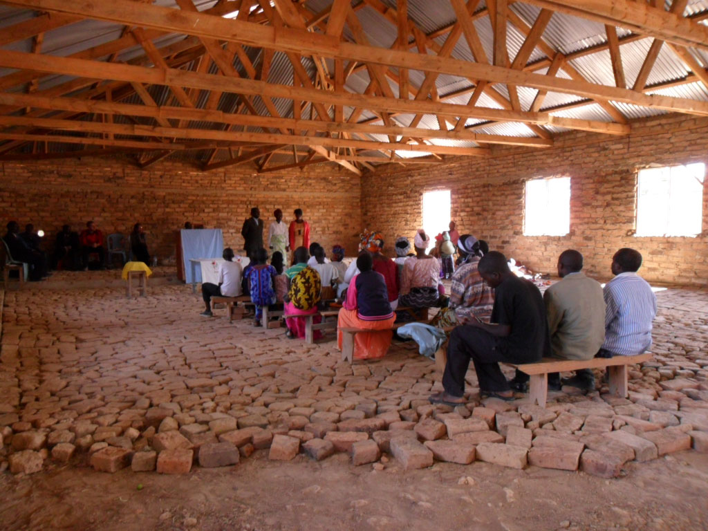 The large building is made of handmade bricks held together by, what I assume is, a mix of cement and mud. Sounds of Swahili words being sung without the aide of a microphone or instruments (save, one drum) drift out of the paneless windows and doorless doorways. We are led to another brick building a few feet from the church. If you can picture what the ruins of a fort or old building look like, you’ll have a good picture of this place. We pass through a curtain hung on a line serving as the door to the ruins and immediately turn right, into a cavernous room with no rooftop, but filled with two couches, a couple of chairs, two small tables and a dish hutch. It’s inviting.