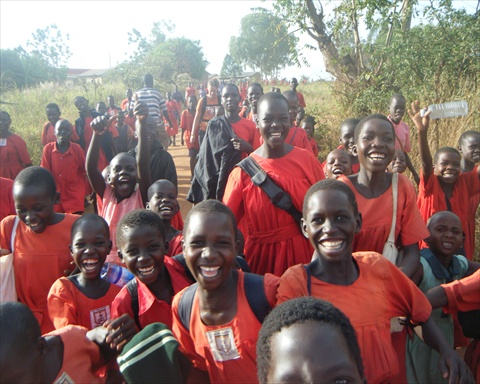 (Holland and I were swarmed by joyous school children who were delighted to carry our water and hold our hands while moving down the country roads of Lira, Uganda)