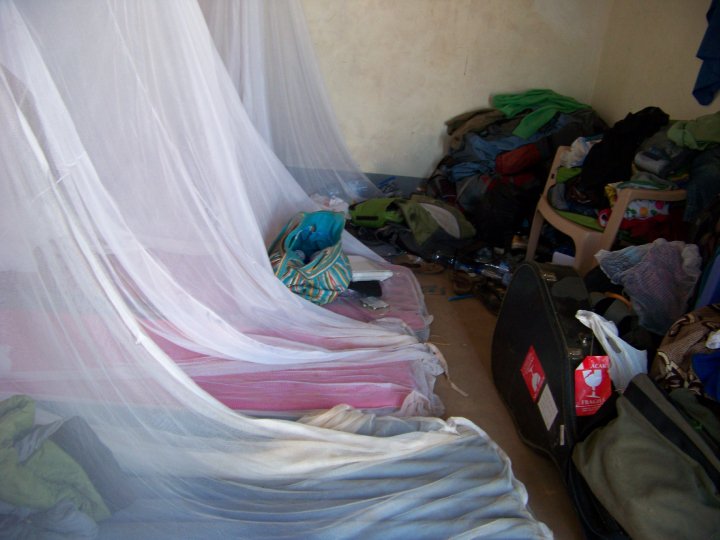 (Above: The very hot one room sleeping quarters. The girls did a fabulous job creatively hanging mosquito nets before I arrived)