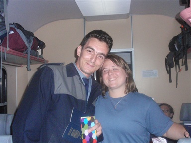 (Ashlee on the train to Sofia with a happy border guard (rare) – middle of the night crossing into Bulgaria – a practical jokester – tried convincing me he‘d lost my passport)