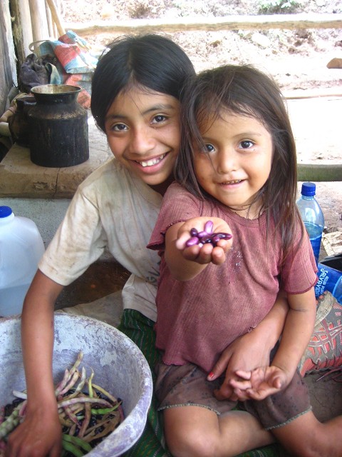 It was an uphill walk and felt like we were in the jungle in the middle of nowhere. After we tripped and slipped our way along, we came out at a corn field on a steep hill. The beans all grow around the corn stalks, I guess you use less land that way, and it´s easier to keep track of them. We crawled around on the steep hill picking the purple beans. We gathered a few sacks full & Juana took some corn for dinner & we hiked back. We ate lunch and then went back to shuck the beans for almost 3 hours (that was with 6 adults & 4 children working)! In the end, the family got 2 big baskets of beans which should last them awhile.