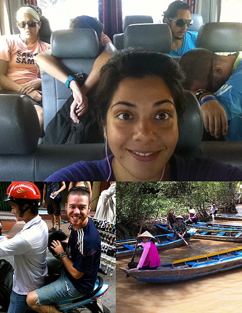 Top: A typical van ride with our team. Mouths open, arms wrapped around seats, heads down. It's how we travel. Bottom left: Brian showing our favorite and most dangerous form of transportation…the MOTO. Definitely not for the faint of heart. Bottom right: Canoes on the Mekong River. These ladies were no joke. This was bumper cars Vietnamese style.
