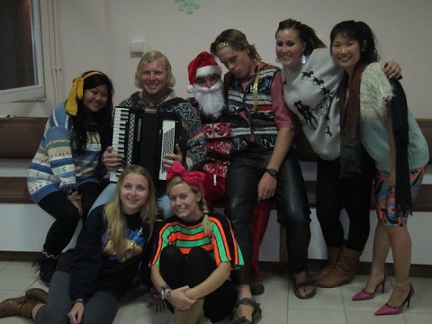 (Alright, as a present to you guys, here is a picture of one of my more infamous outfits on our Christmas/80’s sweater praise night (see previous blog).  And yes, those are leather pants.  Clearly I am enjoying freedom in Christ