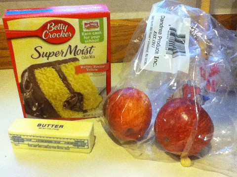 Step 1: Buy a cake mix, apples, and a stick of butter.