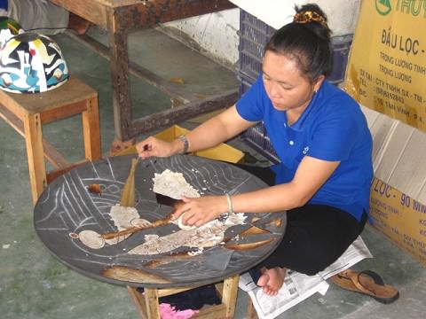 made from egg shells and seashells carefully arranged then dyed, and varnished.