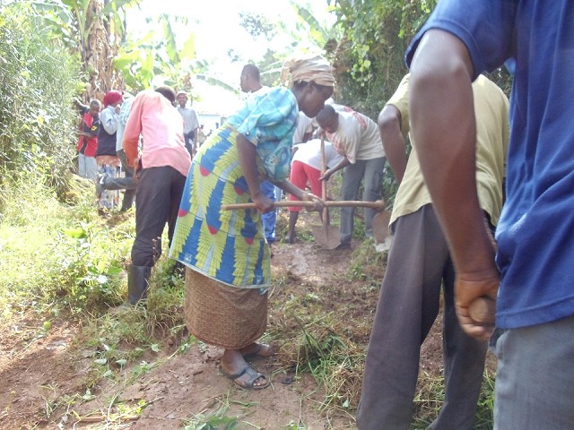 Today is Umuganda, the fourth Saturday of each month which is set aside as a national day for community development. Each member of the community gets together on this morning to work on a project of their choice. Our project today was clearing the “road” (yes, the dirt we are standing on is the road) so that people and motos could get down to the main road more efficiently. Directly after the time of work, everyone sits down for a community meeting to discuss security, next month’s project, and any other community business. Umuganda is taken very seriously as no form of transportation is allowed to run or business allowed to be open on this day.