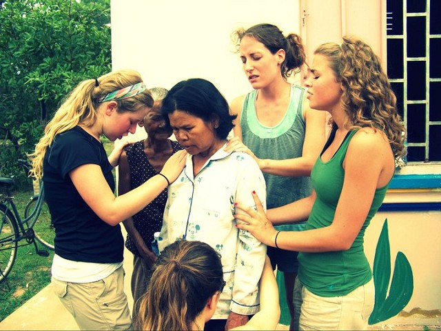 Maggie and Olivia praying for healing for a woman in Cambodia.