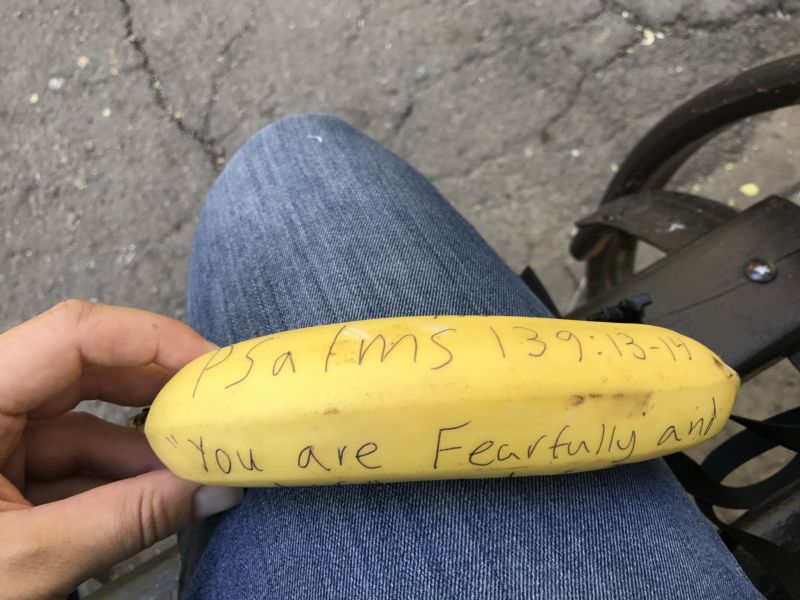 I bought the banana to hand to a woman that I had seen outside on the streets. When I got outside she had left. So I was just walking the streets with this banana and was like why not write encouraging Truths on it “that you are fearfully and wonderfully made” and that “God loves you” and share that with who ever I give this banana. So I sat on a park bench and started writing. When I was finished I saw a guy sitting near me and offered him the banana but he wasn’t interested. I offered it to a few other people, but they also weren’t interested. I then had this thought; who ever is willing to take this banana probably is a more open person in general and that God was gonna use this to get this banana to a person who was ready/open to hear his Truth 🙂 so I was walking down the street and ran into this girl in her 20’s she didn’t speak much English, but I was able to communicate that I wanted to give her a free banana. She saw the writing and I was able to explain that I wrote on the banana and that she could have it. She took it with an big smile and said thank you and we both went our separate ways. I trust that the Lords words that were written on that banana impacted her that day and I praise God for what he’s doing in her life. A verse that always encourages me is: