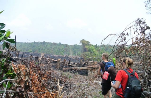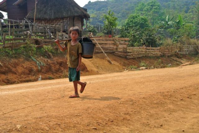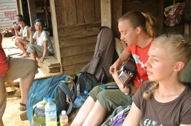 Woke up at 7:00 to the village noises of people, roosters and motorcycles. Went back to the restaurant for a breakfast of pho, the Lao traditional soup and sticky rice. Got our packs, checked out and headed out. The people watched and waved. Walking out of the village, we saw that the lake was bigger than we thought. It was so beautiful, fresh and quiet out! Passed by some buffalo and more villages. There was a trail on the right that we took because during last night’s prayer, one of the girl’s received the word “turn right on a path, they’re ready”. It was like hiking through the woods back at home on a fall day. We were praying for whatever lay at the end. The end was like stumbling upon a new world, “like The Hunger Games” one of the girl’s said. It was a burnt down field. So we turned around and resumed down the main road. Eventually we came to a fork in the road with signs (which were unreadable to us), and we took the right. Passed through a creek and walked by coffee plants up a steep hill. At the very top we could see in the distance, the lake and the glint of sun shining off of tin roofs from the village we had walked from. On the other side of the hill was a tiny village where we stopped to rest at a little shop owned by a precious old grandmother with a toothless smile. The villagers stared at us, uncertain. There were no smiles and greetings. Another traveller passing by, a Vietnamese lady with her little boy, broke the tension as we tried to converse with her using the phrases at the back of the Lonely Planet Guidebook. We learned what the name of that village was and how far it was to the next village. We shared our snacks with them and sang some worship music and prayed over this village as Melody played the guitar. The kids looked so sad and hungry. Little 5 year olds were carrying their 1 year old siblings. There was no joy or hope. They needed the presence of God and that’s what we came to bring!