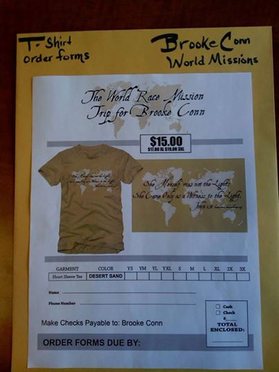 I’m selling t-shirts to help raise money for the World Race. They are $15; please let me know if you’d be interested!