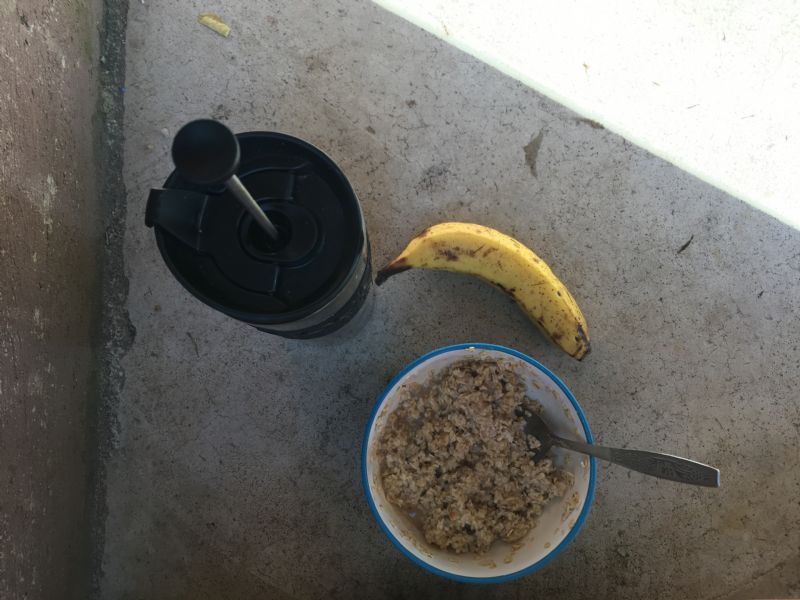 7:54 – oatmeal, a banana, and French press coffee for breakfast