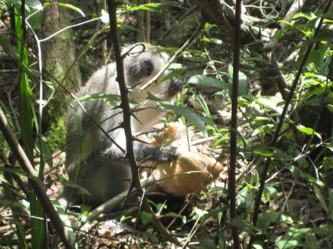 It was the blue-butted monkey who came to steal, kill, and destroy. Heather explained the story. She and a few others we lagging behind as our whole squad was getting closer to the falls. Her bag was over one shoulder and the loaf of bread was swinging in her hand. The stealth creature saw his treasure from a distance. As he came out of the trees that lined the path Heather paused and the two danced around – Heather eyeing the monkey and the monkey eyeing the bread. He jumped, he attacked, digging his fingers into the bagged loaf of bread. Still thinking and believing the bread could be saved Heather swung the bag around hoping the monkey’s grip would release. This did not happen. She thought of kicking but it was too late. The money’s teeth had already begun to feed off of our meal. She let go. He ran but just far enough to still be seen as if he was mocking us loudly.