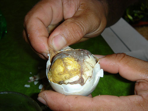 Balut is a fertilized duck egg with a nearly-developed embryo inside that is boiled and eaten in the shell. It is commonly sold as streetfood in the Philippines.