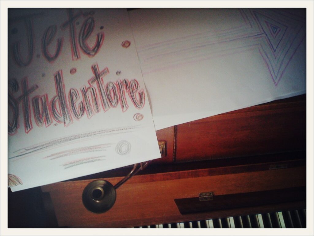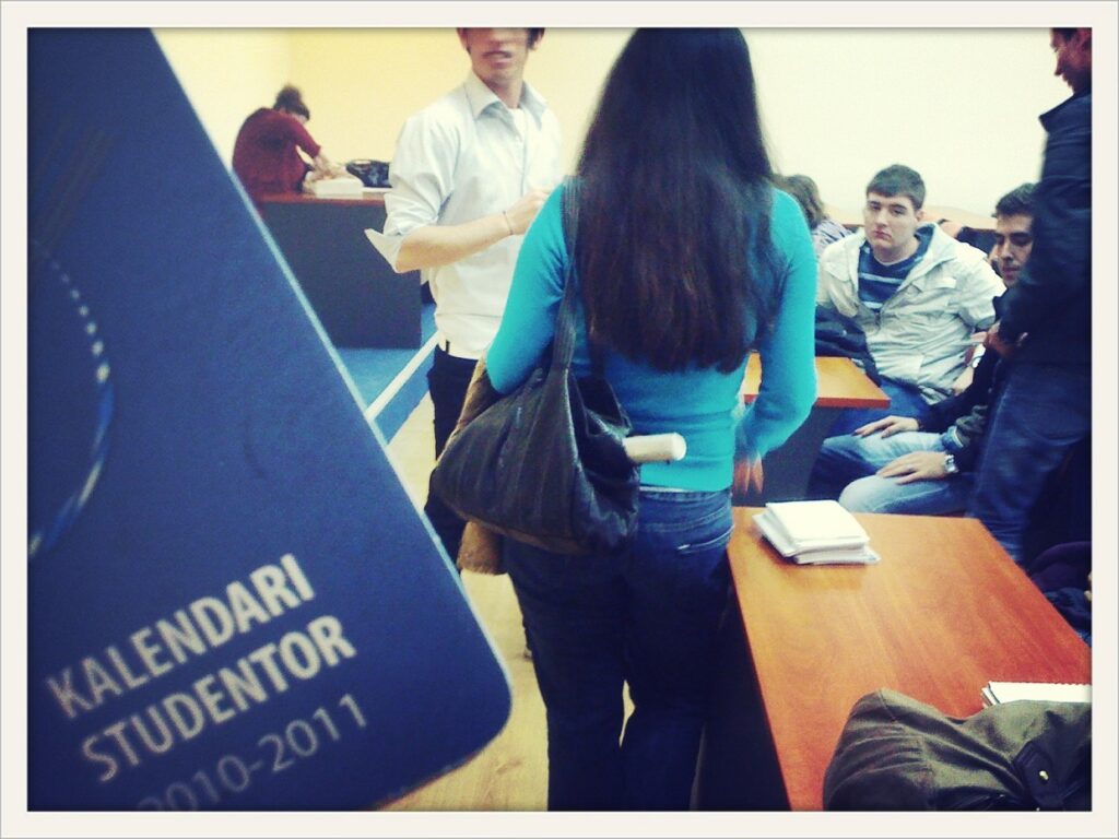 We’re having a gathering here at the office tonight. We’re not sure exactly what they’re going to be telling the students as it’s all in Albanian. But they let us know that they want to invite students to hang out and introduce themselves as a resource to university students for academic and spiritual needs. They tell us we can help out by making signs to direct students, plans games and entertainment. We all pick our tasks and get to work. Jake and Lauren with some crayons for signs, Emily and Tanna writing on slips of paper for a game and Caleb and I learning some music for entertainment.It’s time to leave, we’re going to a University to hand out student planners. Each one has a short survey on the front for students to fill out and give their contact information for