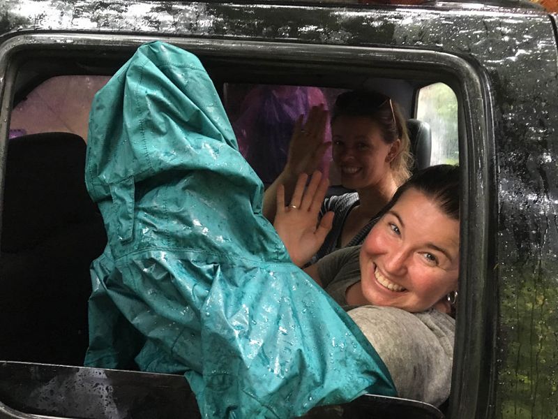 Now the day gets really interesting, we all pile back in the truck, but before we headed home we headed to a generous missionary who donated about 20 huge bags of oranges for us to take home to HoC and other local ministries. As we set off for her home it begins raining, no big deal, we all have rain jackets or ponchos. As we drive higher into the mountains it begins to rain harder and Courtney starts to realize that her rain jacket isn’t really a rain jacket it is just a wind breaker. Courtney is soaked, then it rains even harder and we are all soaked. What do we do when we are riding in the back of a truck, soaked, and lost in the mountains—well we laugh. We laugh because what else can we do. We eventually find the oranges and proceed to load over 500 pounds of oranges and 100 pounds of bananas on top of the cab, on the tailgate, or wherever they fit. Oh, by the way it is still raining. We get back into the truck and start heading home.