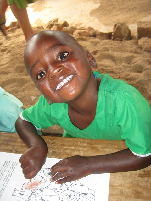 to change into my ministry skirt and be ready to go on time. We were scheduled to spend the afternoon, beginning at 2 pm with the village KIDS! We had split ourselves, and the kids up into three different groups. Before leaving, each group made plans for what they would do. When 2 pm came and we still hadn’t left, we were reminded that we were on African time not American time and told that it’s best not to get there before the kids or we would be sorry! Ok… so we waited about thirty minutes before leaving for our 20 minute walk to the church. Upon arriving only a few kids were there and the church was locked, so we sat and waited and waited and waited some more. Finally, a few minutes after 3:00 when more kids had arrived we decided to start even though the church wasn’t open yet. So we split up into only two groups now, older and younger kids and began the makeshift festivities. Brian, Kate, Beth and I took the little ones. We started off teaching them several simple songs, which proved to be a challenge with the language barrier. They liked the hand motions but had a hard time with the words. Then we got a translator and told them some bible stories. Beth had brought some great coloring sheets of Daniel and the Lions Den so after the stories finished they colored those and it was SO fun to see them enjoy that. They were so excited and cute. It was SUCH a treat to get to ‘paint’ (colored pencils is all we had) as they called it.