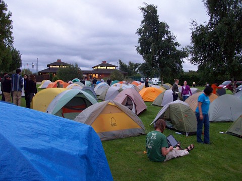 The two squads have now officially split up. For those of you who didn’t know, there are two squads of about 40 or so and the other squad headed north to Northern Ireland(duh) and we are heading south to the Galway area. I will be sure to keep this updated with what is going on. We just finished a two day screen fast, where we weren’t allowed to get on a computer or ipod. I think it was to encourage us to just use the time to really process what was happening, and what we had committed to. It’s a little overwhelming to think about and my first 36 hours were a little rough. Felt somewhat in a daze due to both a lack of sleep and lack of familiar frontier I think. But after I got to take the next afternoon off and process a little bit, I was able to find a little bit of center in the whole deal. That’s all I can really think of right now. Below is a picture of our “tent city” at the camp ground we stayed at. It’s a good one.
