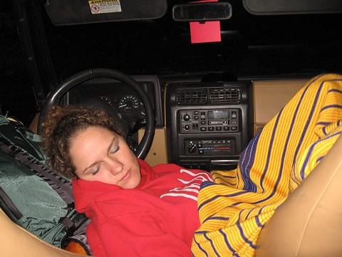 Okay, clearly we didn’t climb up the rock face. But we did manage to climb up crevices between the rocks while handing off our packs to one another, and eventually found our way back to the top of the pinnacle. Now all we had to do was find the CORRECT path and trek the 2 miles back to the ranger station. Which we did in the dark and finally got back around 10pm. So the camping…didn’t happen. It was another 1+ mile strenuous hike to the campsite, so we slept in the jeep instead…but you know what we learned from our adventure? Flexibility and communication are key. Hey, WE’RE WORLD RACERS!!