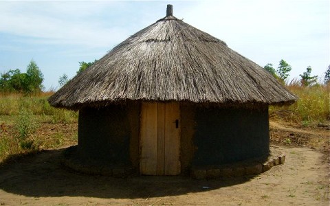 A view of the schoolhouse where the women and children live, eat, work and go to class: