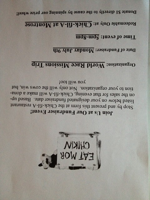 Monday, July 9 from 5-8 there will be a Spirit Night held at the Montrose Chick-fil-a. Feel free to print the coupon below if you can make it!