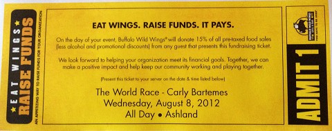 Who's hungery for BW3? Print the flyer and join us for lunch or dinner at the Ashland BW3. A portion of your bill will go to my World Race account when you present your flyer to the server with your check.
