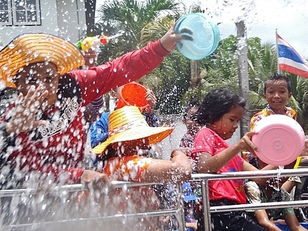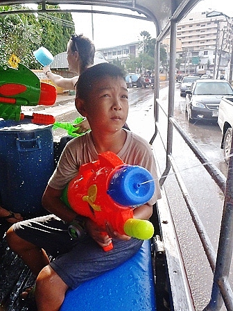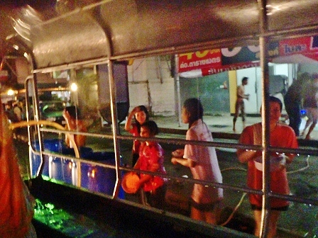 appropriate supplies needed to drive into the thick of celebrations. As we loaded onto the two benches bolted in the back of the pickup Pa decided to kick off the New Year by spraying us with the water hose, our first of many attacks that night. At first it was shocking to see such small children toting