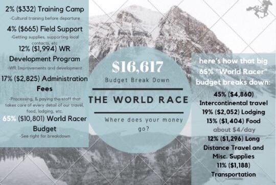 • 65% ($10,802) World Racer Budget – See below for further breakdown!