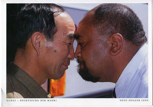 The traditional greeting involved people touching and lightly rubbing noses together.  This is known as the Hongi, a formal Maori event.