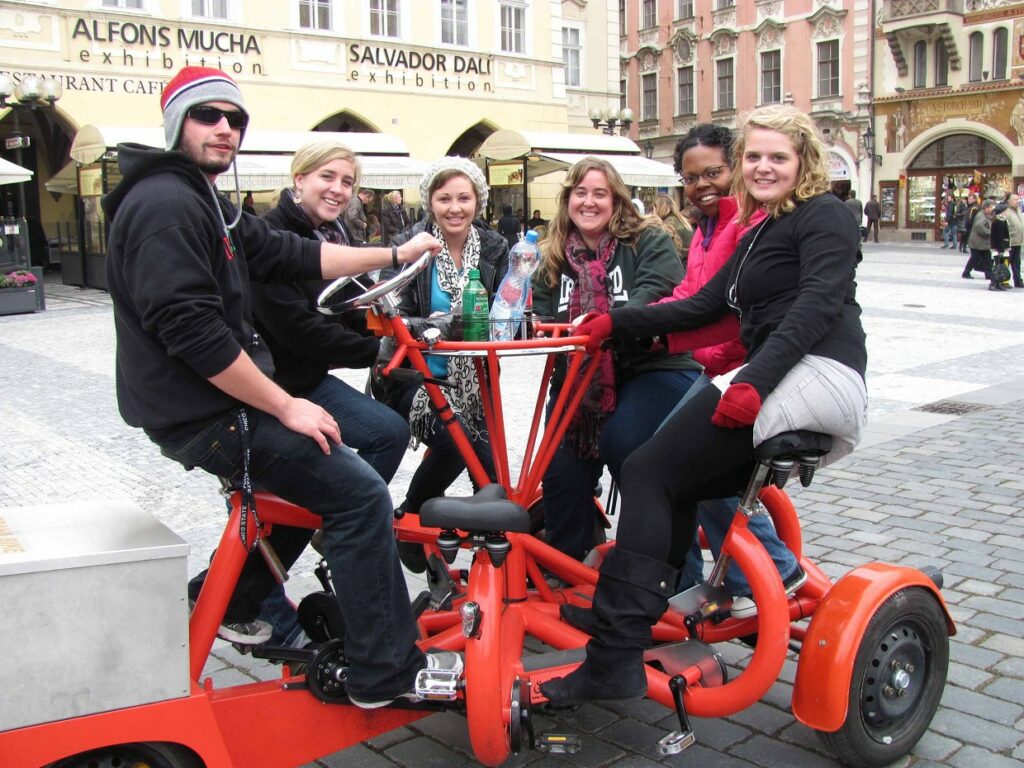 Jeanne Bensch and I walked around Old Town Square of Prague in Czech Republic looking for people to video. We were wanting to know how the people of Prague felt about God…about religion. We ran into American university students who were promoting a bar on a special-made 7 person round bicycle. God organized this whole day, allowing Jeanne and I a two hour ride with our new friends who spoke all about the people of Czech.