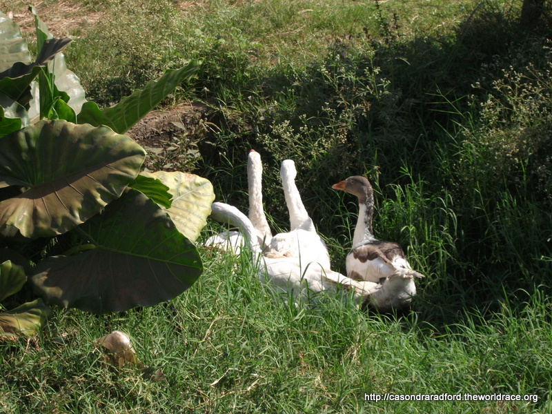 7. Entertainment for the day are ducks, pigs, goats, sheep, chickens, and cows crossing the road.
