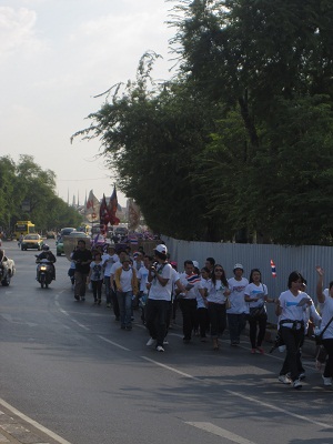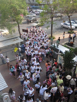 We take a bus, hop on a boat and go to some place off course i have no idea where we are. But we walked and walked then all of a sudden we see a bunch of people walking in white t-shirts with Thai flags waving. I was like what are you serious, what is going on….