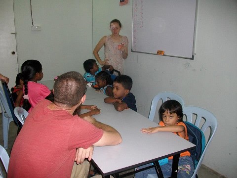 We also taught at the village their, but there were only 4 kids who came. All the others ran off into the jungle when we arrived because they were afraid. The four who did show up knew no English at all and were so shy it was hard to teach them much, but we did get to sing to them and teach them how to play frisbee.