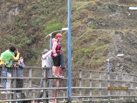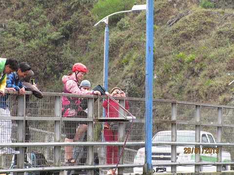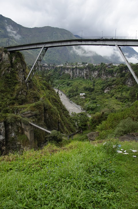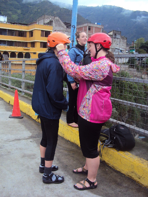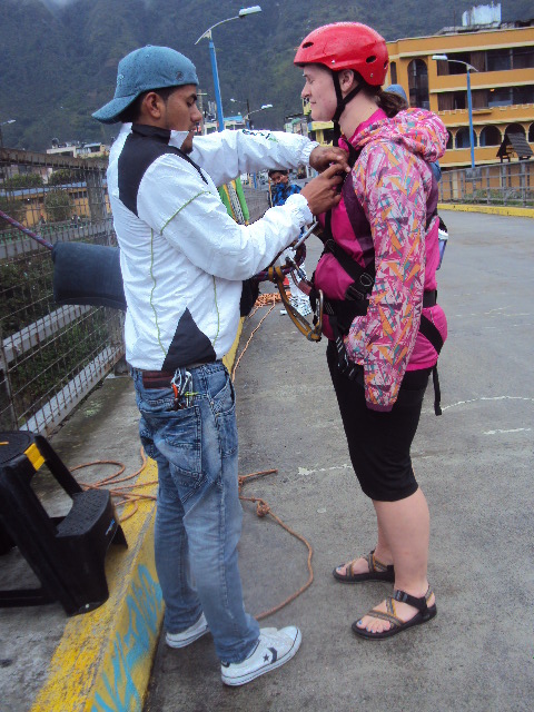 We suited up in about three harnesses and walked, helmets in hand, across Banos from our wonderful adventure booth (we used the same fantastic company for all the weekend’s events and were so satisfied!) to the bridge on the outskirts of town.