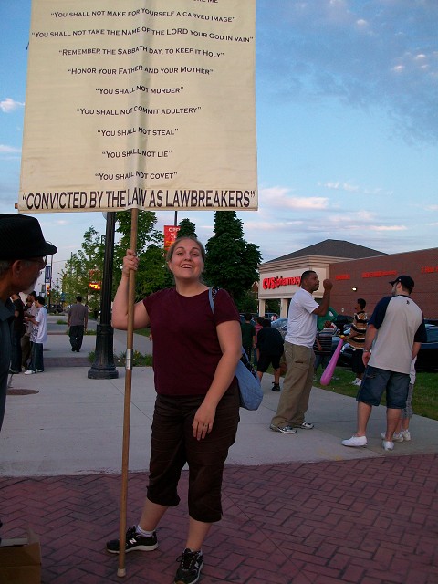 It is hard to tune it out when it is all around you, and while Annie is halfheartedly conversing with the sign holder, I stand and nod politely and try to listen to their conversation instead of the many others going on around me. The sign holder leaves, and Annie holds the sign for a few minutes, and we hang around until the apologetics team loads up and moves out before we head over to the park to meet the rest of our team at the park.