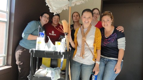 He comes back outside and he asks, “Would you want to clean?”  “Sure” we all answer.  So, he then introduces us to a black man named Kenneth that is going to show us where we are to clean.  We then proceeded to deep clean 4 lobby areas.  We did windows, floors, polished furniture and dusted.