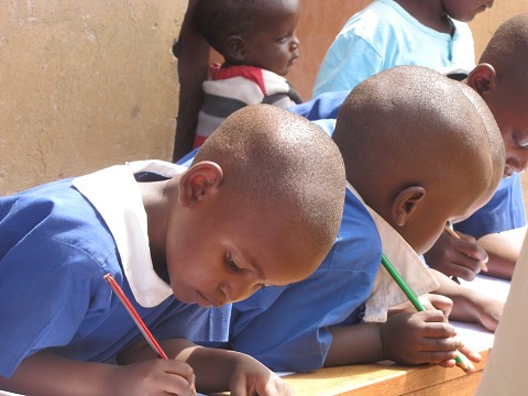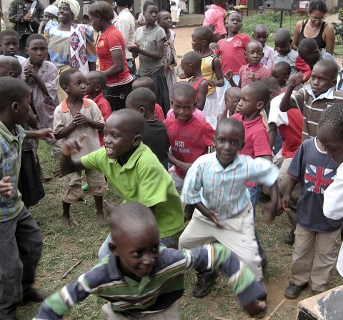 So picture a circle of children, bright clothing, brighter smiles, new