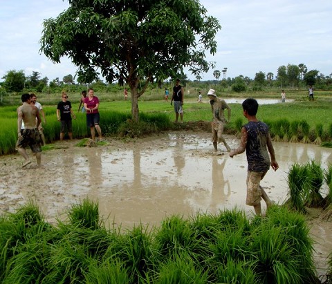 We finish eating and the boys begin to head out to the rice fields for the morning work. We follow in suit with them and mimic them until we have the technique down. First step is to jump in the rice paddy. A field dug out and fashioned to hold water and sustain the rice plants with a mixture of mud, manure, and water with green sprouts speckling the brown landscape. We pull the sprouts, slaps the roots on our feet and wash the roots off and then make a pile to be planted further apart (Just in case you are ever in the need to know how to grow rice…).