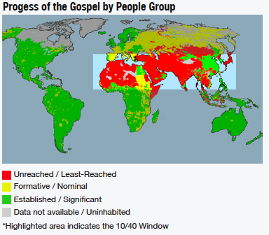 The 10/40 Window identifies a section of the world map encompassing North Africa, the Middle East, and Asia. It extends from latitude 10 degrees N to 40 degrees N of the equator. In and around this rectangular area lives the world’s least evangelized, most unreached people groups in terms of Christian missions. The countries in the 10/40 window are either officially closed or informally opposed to Christian ministry within their borders.