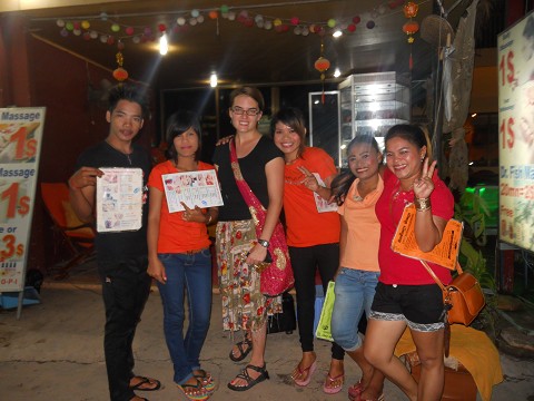 We stopped specifically at one place where we met four women and a man who were all in their 20s. We found out about their husbands and children and how they work 10 hour days, but don’t get much business. We saw them stop talking to us and run up to random single men (VERY CLOSELY) to try to entice them to come and get massages. We saw the reality of their lives. We talked with them for a few minutes, took a picture and went on our way. We will be going back the next two nights.