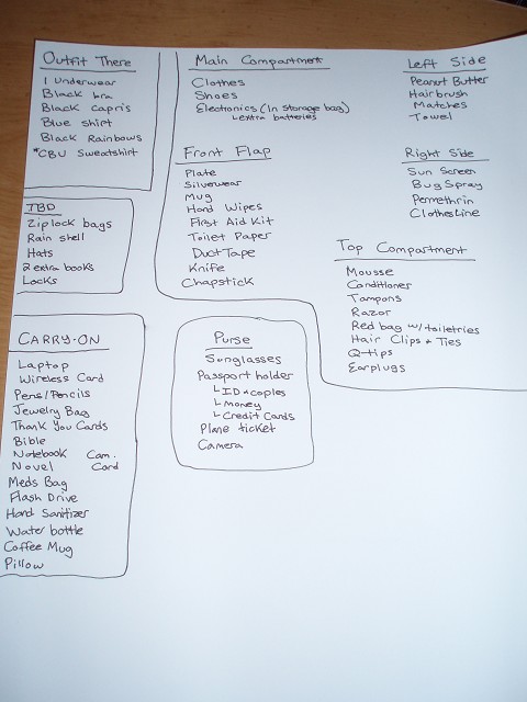 So i did a trial run the other day of packing my gear. I was going to just wait, because I’m one of those people that like to do things completely or not at all… so the idea of packing stuff up just to unpack it and redistribute it in my room did not sound appealing. However, I finally realized why they recommended that we do so. It took me about 4 hours, no joke! It took me forever to decide what clothes to bring, how to best fit it in, my dad was paranoid about the valuables not being in any pockets, and basically I just had too much crap to begin with!