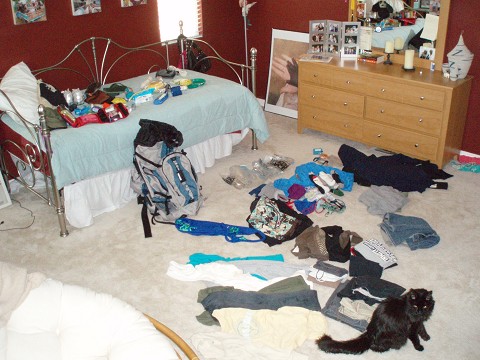 So here is all my stuff that I originally planned on bringing. Stuff scattered all over my room, on the floor, on the bed, the dresser, and in the closet. All thinking it’s going to make it into that little blue and gray bag that is next to the bed. Even my cat thinks he’s going 🙂