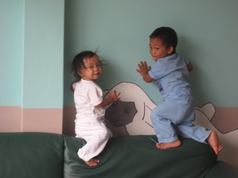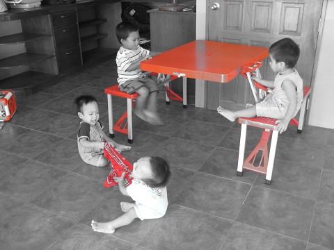 Here’s a good idea of what it’s like to work in the nursery. Moses does things he’s not supposed to do (like moving this table in front of the door), then Andrew joins in, and there in the front you have the twins fighting over a toy. Typical nursery scene.