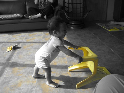 Jacob’s favorite activity in the nursery…. pushing a chair around the room…. really, who needs to buy toys??