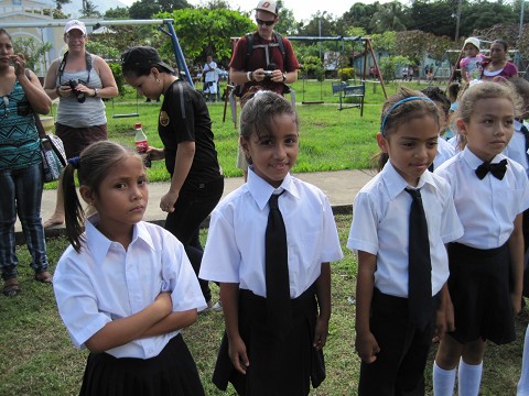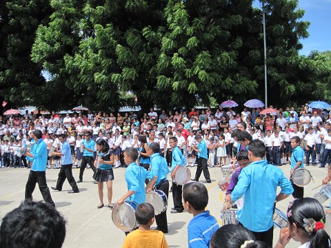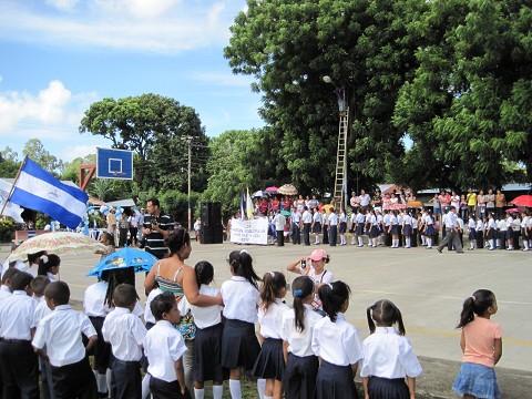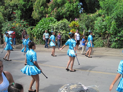 The World Racers and other CICRIN workers went by rickety bus to Los Angeles this morning to watch the kids march in the parade. At a certain point, the parade stopped at this basketball court for dance and band performances. There were a few dances with the marching band and a few with girls dressed in traditional dresses. Then there was a dance with shirtless teenage boys and girls in miniskirts and tank tops. To be honest, it looked like they were having sex instead of dancing. To be even more honest, it’s nothing I haven’t seen in clubs back in the States.