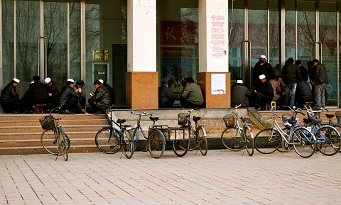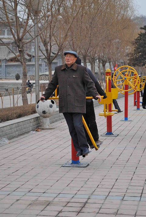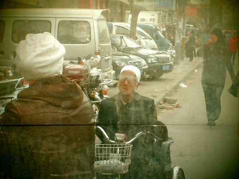 Many of the elderly Chinese men wear giant, circle-shaped, tinted glasses.