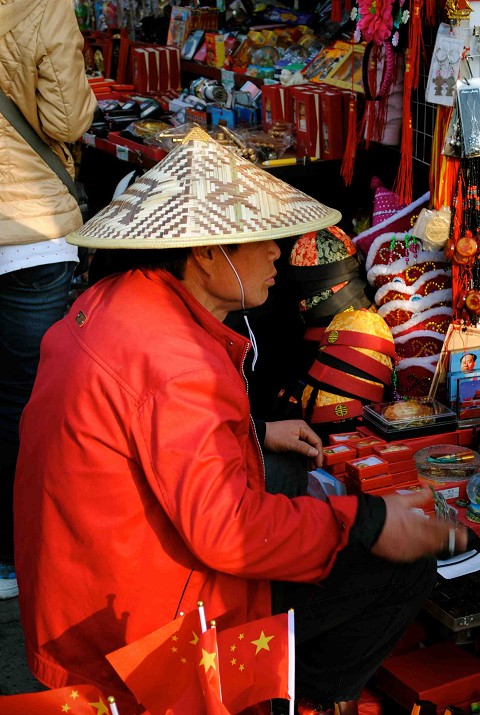 Chinese market man showing off his rice-patty hat. Red is a very prominent color in China.